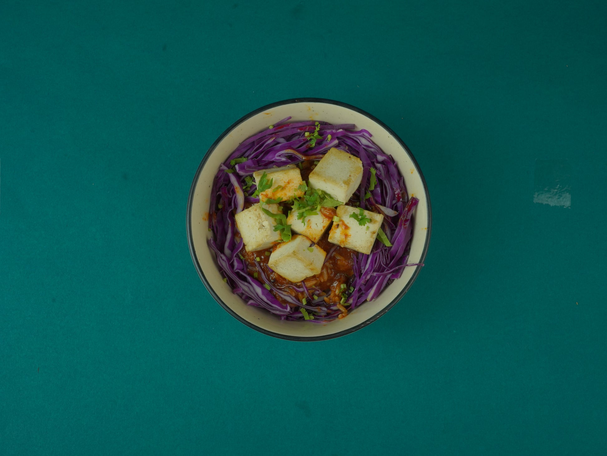 Crispy pan-roasted tofu glazed with spicy gochujang sauce, served with purple cabbage slaw and steamed rice. Bold flavours with clean nutrition.